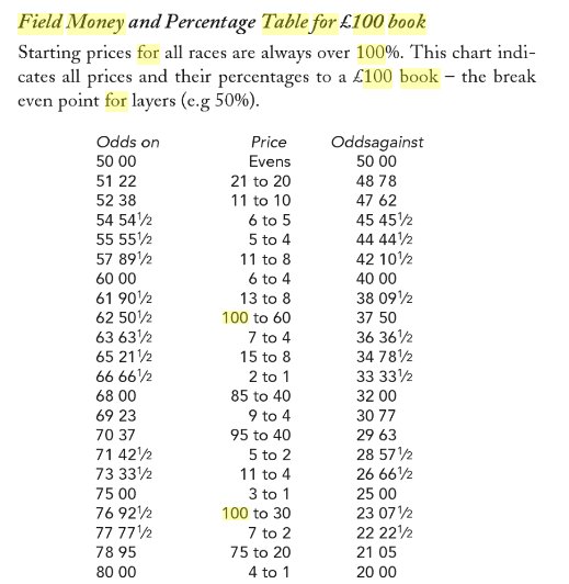 It showed the odds which could be offered to make a book on various bets wagered in a race and how to make a profit on most outcomes. Obviously if a hot favourite won and there was little money for the other runners, even paying out at odds on the bookie would lose but Jessie had read of “skinners” winning-horses no one fancied. Even if a housewife liked the name and had a shilling on at 50-1 no one else would have and the bookies would keep all or almost all in their satchels.