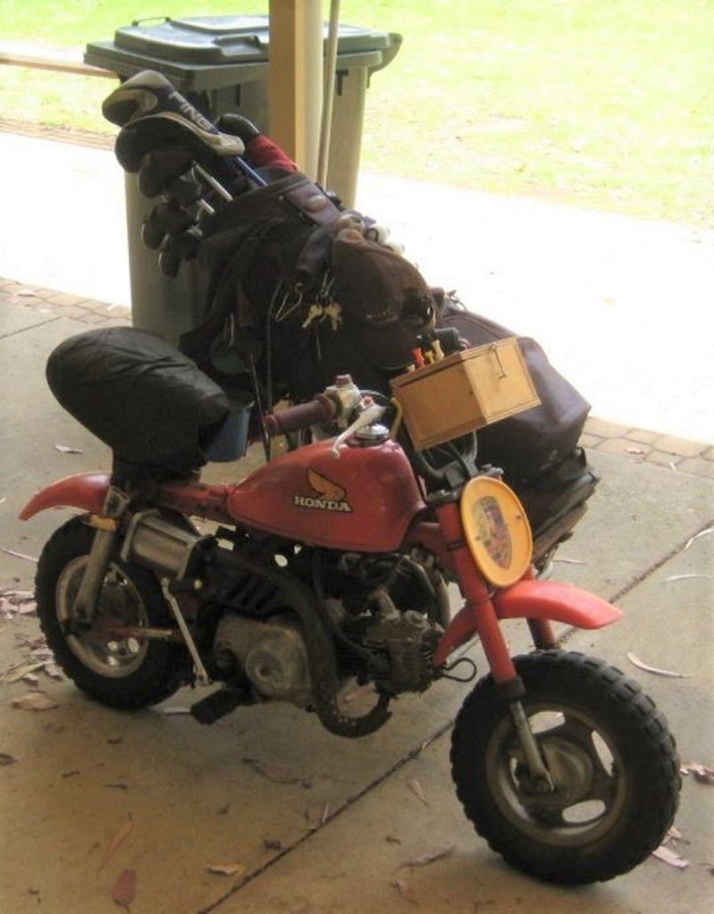 Jim used an early three wheel push trolley, and marvelled at the explosion of carrying options, including ‘stand’ bags and the emergence of dual-strap golf bags that were said to reduce back strain. He remembered the extraordinary motorised golf trolley he saw at a sand-green course in rural Western Australia, the power source being a small motorbike, the device being completed by a welded chassis with a third wheel.